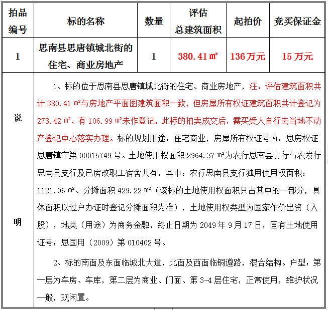 1、思南縣思唐鎮(zhèn)城北街的住宅、商業(yè)房地產(chǎn),建筑面積共:380.41㎡;起拍價:136萬元;競買保證金15萬元。