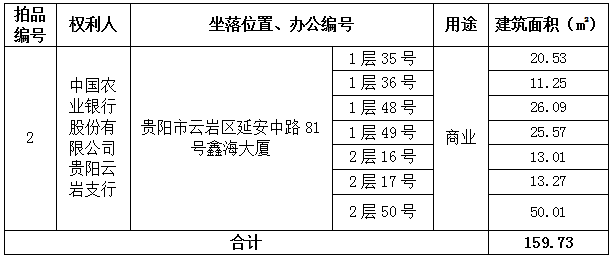 2、貴陽(yáng)市云巖區(qū)延安中路81號(hào)鑫海大廈1層35、36、48、49號(hào)及2層16、17、50號(hào)商業(yè)房地產(chǎn)(總建筑面積:159.73㎡);