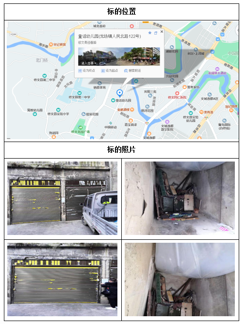 標(biāo)的位于修文縣龍場鎮(zhèn)迎春路52號,建筑面積為30㎡,共兩個獨(dú)立車庫。實際用途為車庫,該標(biāo)的東至迎春路,南至小區(qū)道路,西至小區(qū)道路,北至小區(qū)道路;建筑結(jié)構(gòu)為磚混結(jié)構(gòu),層高約3米,無物業(yè)管理,戶型結(jié)構(gòu)為開間。