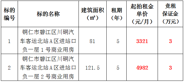 1、銅仁市碧江區(qū)川硐汽車客運(yùn)北站A區(qū)進(jìn)站口負(fù)一層1號(hào)門面,面積:81㎡,租賃期:5年,起拍租金:3321元/月,競(jìng)租保證金:3萬元;