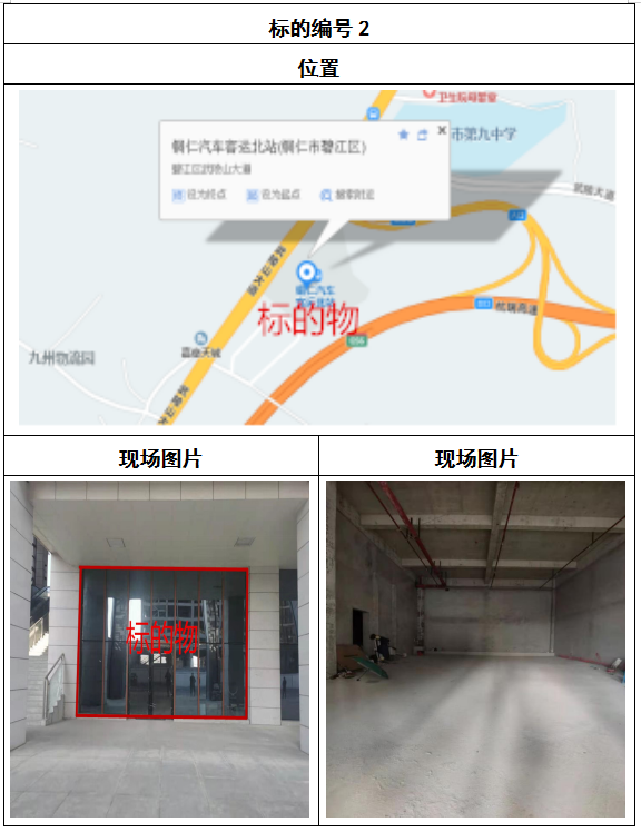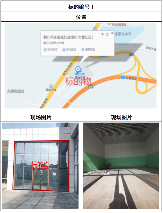 拍品1號(hào)和2號(hào)標(biāo)的位于銅仁碧江區(qū)川硐汽車客運(yùn)北站A區(qū)進(jìn)站口負(fù)一層1-2號(hào)的商業(yè)房地產(chǎn),位于銅仁市中心以北,銅仁汽車北站安置旁,建筑面積分別為:81㎡、121.5㎡,租賃期5年,該標(biāo)的位置交通便利,人流量大。