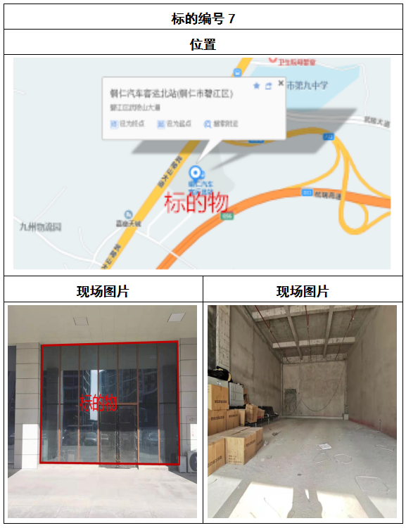 拍品3號(hào)至7號(hào)標(biāo)的位于銅仁碧江區(qū)川硐汽車客運(yùn)北站A區(qū)進(jìn)站口負(fù)一層3-7號(hào)的商業(yè)房地產(chǎn),位于銅仁市中心以北,銅仁汽車北站安置旁,建筑面積分別為:121.5㎡、121.5㎡、81㎡、121.5㎡、121.5㎡,租賃期5年,該標(biāo)的位置交通便利,人流量大。
