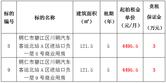 9、銅仁市碧江區(qū)川硐汽車客運(yùn)北站A區(qū)進(jìn)站口負(fù)一層9號(hào)門面,面積:121.5㎡,租賃期:5年,起拍租金:4495.5元/月,競(jìng)租保證金:3萬元。