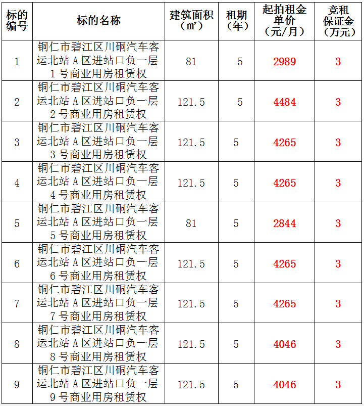 3、銅仁市碧江區(qū)川硐汽車客運北站A區(qū)進站口負一層3號門面租賃權(quán),面積:121.5㎡,租賃期:5年,起拍租金單價:4265元/月,競租保證金:3萬元;