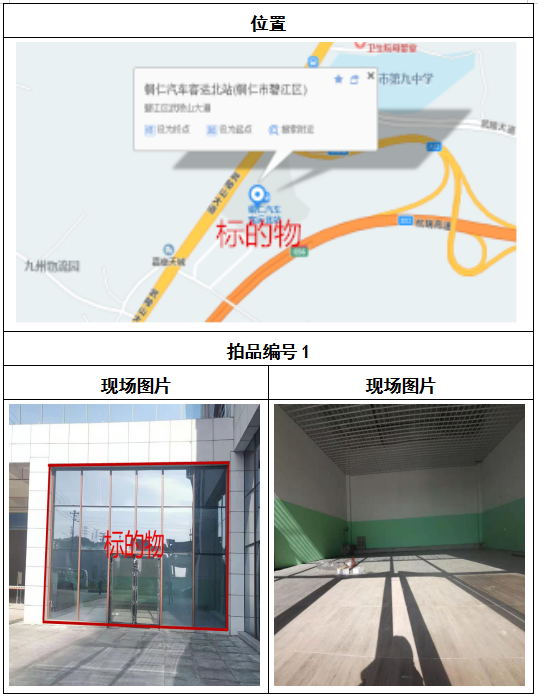 拍品1號-9號標的位于銅仁碧江區(qū)川硐汽車客運北站A區(qū)進站口負一層1-9號的商業(yè)房地產(chǎn),位于銅仁市中心以北,銅仁汽車北站安置旁,建筑面積分別為:81㎡、121.5㎡、121.5㎡、121.5㎡、81㎡、121.5㎡、121.5㎡、121.5㎡、121.5㎡,租賃期5年,該標的位置交通便利,人流量大。